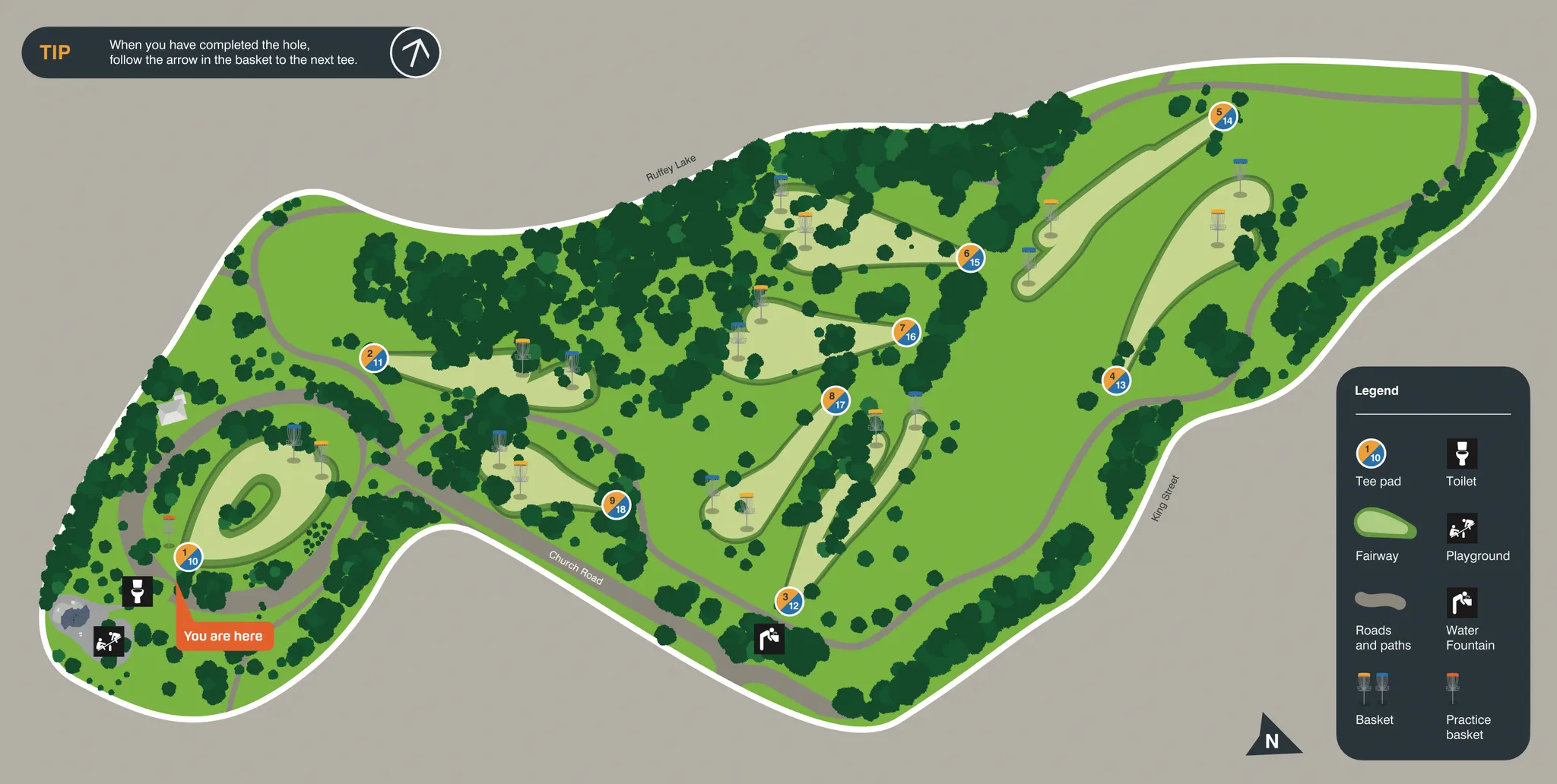 - 18 holes (9 tees, 18 baskets)